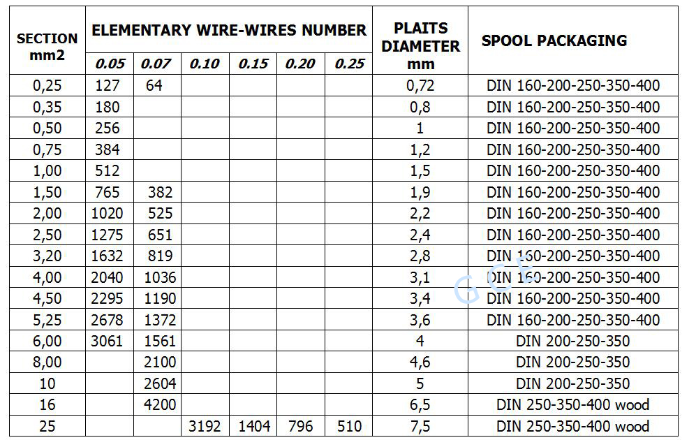 Manufactured according to DIN 46438, with bare or tinned copper wires. Plaits are made up of more “l(fā)ittle plaits” even making a concentric plait (1+6). The right or left lay length is obtained on customer’s request. They show a very firm surface and regular diameter. On request, it is possible to produce sections up to 25 mm2 having elementary wire 0.05÷0.25 mm.